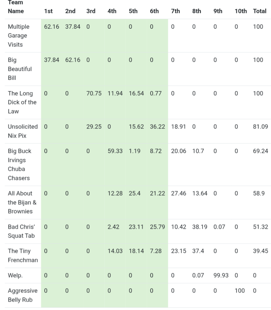 Dweeb (1-1) vs Kyle (2-0): It was over Thursday night when cook began cooking up my second win! Fun fact- This is the first time I’ve started 2-0 since 2018.